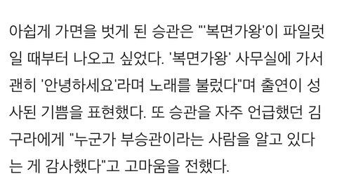 가면을 벗은 승관은 "'복면가왕'이 파일럿일 때 부터 나오고 싶었다. '복면가왕' 사무실에 가서 괜히 '안녕하세요'라며 노래를 불렀다"고 밝힌 승관 ㅋㅋㅋㅋㅋㅋㅋㅋㅋ
