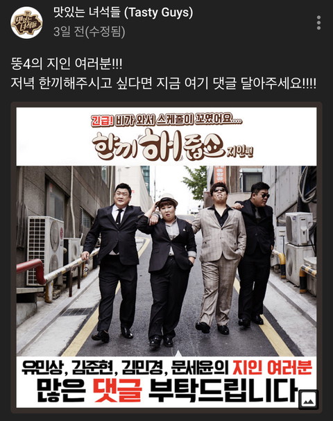 저녁 한 끼 해주시고 싶다면 지금 여기 댓글을 달아달라는 글이 올라왔음