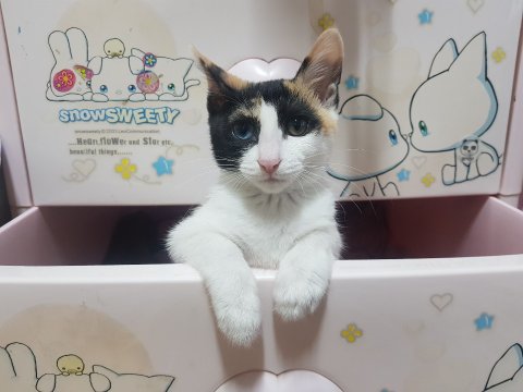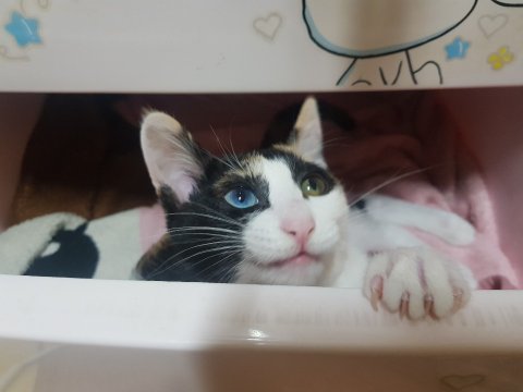까꿍~ 이사진은 고양이들은 숨을곳을 좋아하고 구석진 곳으로 잘 들어가길래 울 딸램 어릴때 쓰던 서랍장을 통째로 비워서 놀이터처럼 놀게 해줬다. 들낙날락 위 아래로 오르락 내리락 좋아라 한다.