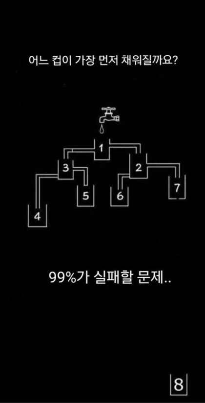 수도꼭지에서 나오는 물의 초당 수량에 따라 다름. 겁나 많이 나오면 가장 위에 있는 1번부터 만땅됨. (빠져나가는 물보다 채워지는 속도가 더 빠르기 때문에) 그게 아니라면 8번부터 채워짐. 근데 너무 쉬운거 아님??