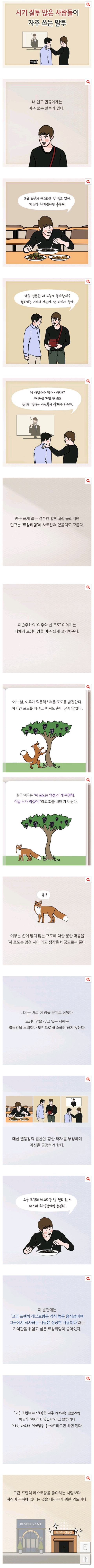 흑백논리. 실제로 저런 열등감으로 저렇게 글 싸지르는 사람들도 있는반면 순수한 개인적 의견으로 제시하는 사람도 있을것이다.. 명품, 보세 이야기 사업가 성공이야기 저게 열폭하는걸로 예시를 든거면 저 삽화작가의 사상이 심각할정로 걱정이 된다. 가난한 사람들이 나는 명품보다 편한옷스타일이 좋다하면 저 작가는 열등감에 근거해서 신포도얘기를 들먹일것이고 반대로 부자인사람이 명품보다 편한옷이 좋다하면 그때는 어떻게 할것인가? 그 때도 신포도 얘기를 들먹일것인가? 그냥 올림픽 동메달리스트 3등이 난 3등에도 만족한다고해도 1등에 대한 열등감으로 치부할것인가? 인터넷 열등감정신병걸린 몇몇 메갈일베들빼면 그렇게 악의담고 말하는 사람 많지않다.