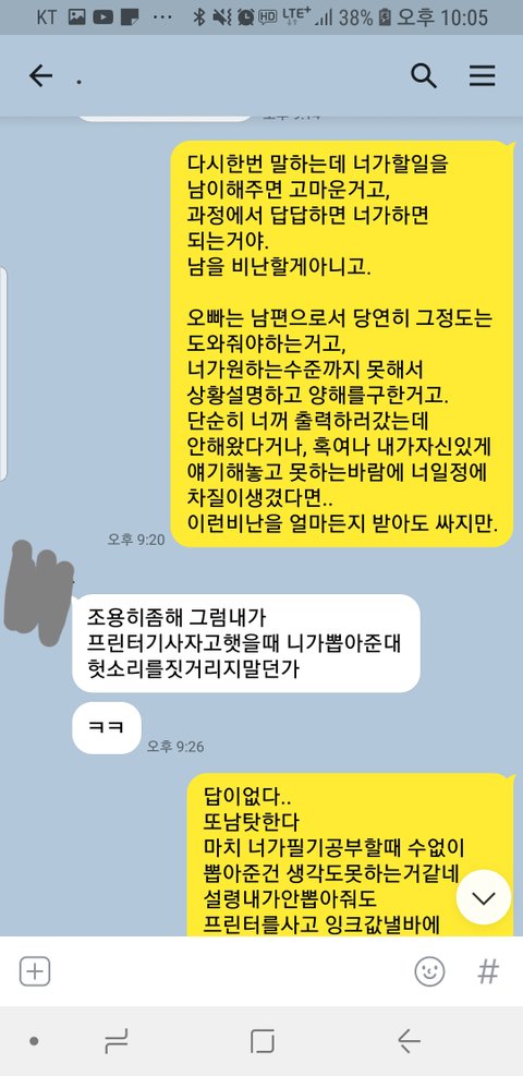 와이프가 중요한시험 준비중->원서관련서류 출력부탁(다음주 제출)->외근 후 사무실복귀하여 출력하면 오늘 날이 날인지라 시간이 너무늦어 귀가를선택(일찍가기로 약속도 했음)->출력을 해오지 않은게 발단이 되어 다툼->다툼이 격해져 진정 후 서로 떨어져서 카톡으로 대화
