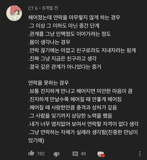 김달인가 그분 유튜브에서 전남친 전여친 연락 뭐 이런거 보는데 뭔가 마음아프다 연락이 없어서 좋은걸까 싱숭생숭하네