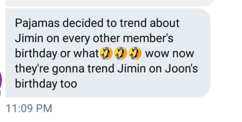 번역 : 파자마(외국의 찜앰 비하 호칭)들이 모든 멤버의 생일이나 그런 날에 지민이 실트 올리기로 결정했나봐 ㅋㅋㅋ 와 이제 얘네들은 남준이 생일에도 지민 해시 실트 올릴거구나 ㅋㅋ