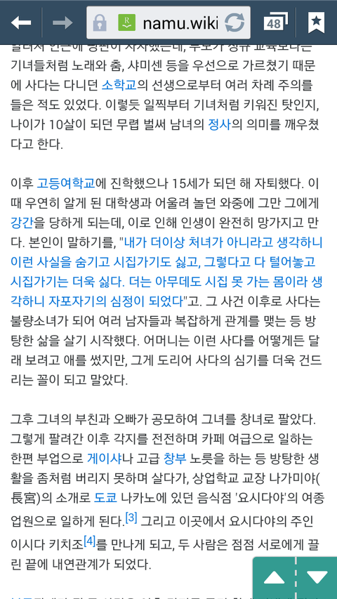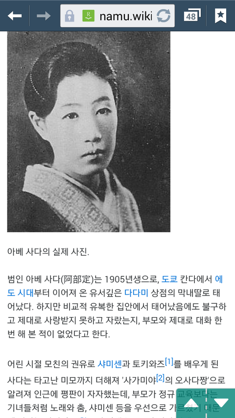 ☆☆☆☆☆그후 그녀의 부친과 오빠가 공모하여 그녀를 창녀로 팔았다. 그렇게 팔려간 이후 각지를 전전하며 카페 여급으로 일하는 한편 부업으로 게이샤나 고급 창부 노릇을 하는 등 방탕한 생활을 좀처럼 버리지 못하며 살다가, 상업학교 교장 나가미야(長宮)의 소개로 도쿄 나카노에 있던 음식점 '요시다야'의 여종업원으로 일하게 된다.[3] 그리고 이곳에서 요시다야의 주인 이시다 키치조[4]를 만나게 되고, 두 사람은 점점 서로에게 끌린 끝에 내연관계가 되었다.