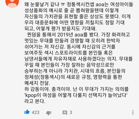 맞아 맨날 남아이돌 백댄서로 노출 심한 여성 백댄서 썼는데 이렇게 여남 의상 바뀌니까 확 와닿음. 다들 탈코르셋 하자. 의상으로만 봤을 때 노출 있고 섹시한 남백댄서들 보다 수트 입고 노출 없는 aoa 옷이 더 권력있어 보임.