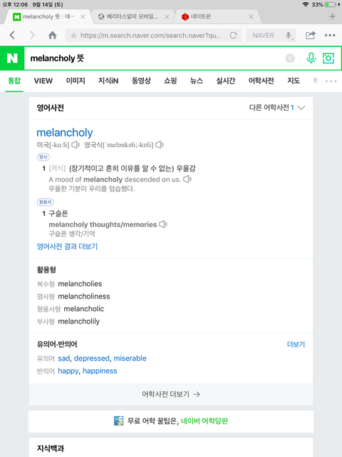 19는 이런 뜻으로 생각하는 애들 ㅈㄴ 많은거같아서;; melancholy 뜻 묘하다, 꼴린다 이런뜻이 아니고 원래 뜻 우울하다, 우울이야ㅋㅋㅋㅋㅋㅋㅋㅋㅋ 제발 단어 어감 있어보인다고 아무데나 갖다 쓰지마 판에서 잘못쓰는애들 한두명 본게 아님