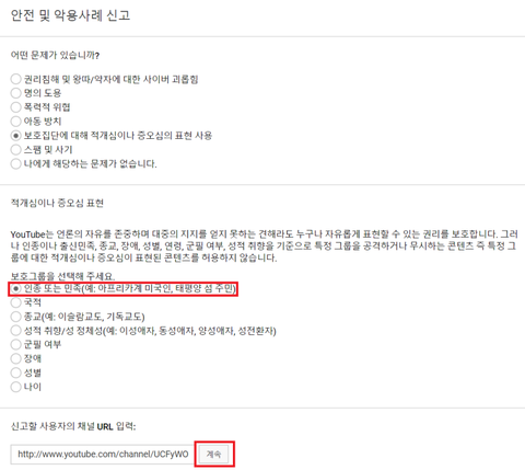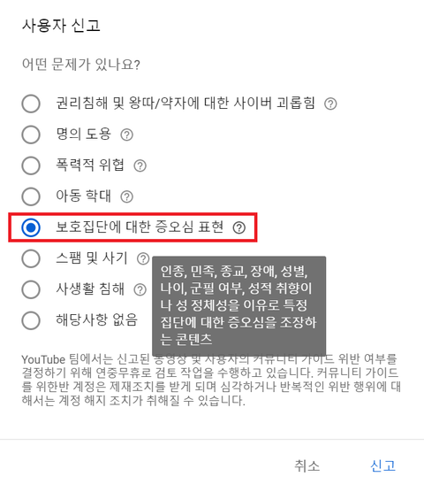 6. 신고메뉴 중 '보호집단에 대한 증오심 표현'을 선택합니다.