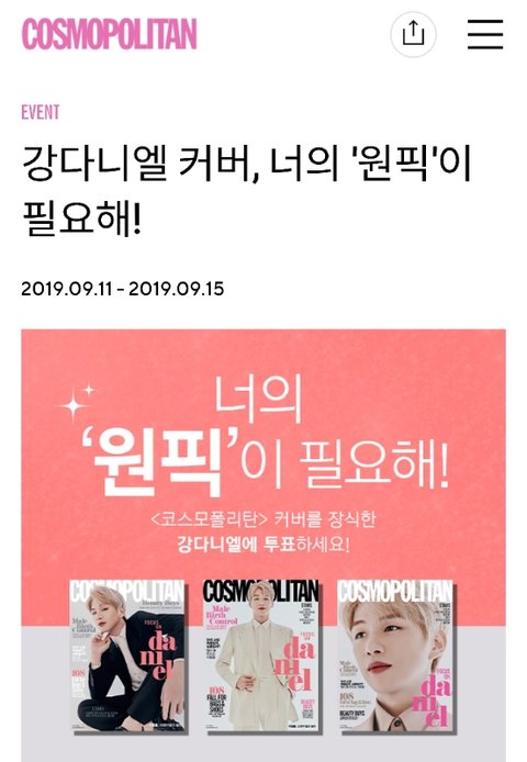 https://www.cosmopolitan.co.kr/event/detail/71 코스모폴리탄 강다니엘 커버, 너의 원픽이 필요해! 오늘까지 투표야 깜빡한 다니티들 참여해주세오