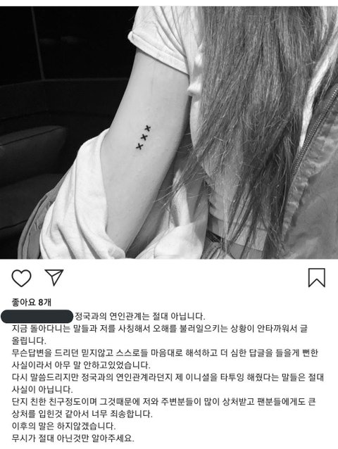 타투이스트 분 인스타에 글 올리셨어 소속사 측에서 강경대응 한다고 했으니까, 근거없는 루머 유포는 그만해줬으면 좋겠고 내 아티스트에 대한 믿음 조또없는 허물 뿐인 팬들은 잘 꺼져ㅗㅗ