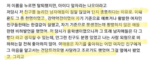 오늘 학폭이라는 자극적인 단어 써가며 판에 누군가 원글자의 글을 퍼왔는데 원글쓴사람 태용 학폭 언급한적도 없음. 댓글하나만으로 학교폭력이라고 말하는건 넘 과함.
