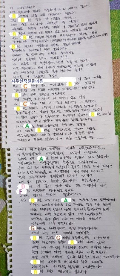 제가 저 편지를 쓰고 일주일간 출근을 안했을 때 중간에 수녀님들을 만났을 때 저는 제가 정신과에 다닌다는 사실을 말했습니다 어디다니냐고 물어보길레 상호명까지 말했습니다. 내가 얼마나 상처를 받았는지 보라고 무슨일을 한거냐고 일부러 말했습니다 지금 생각해보면 상처 돌려주기였습니다. 이날 수녀님께서 B대리님이랑 친구하지 않아도 된다고 B대리님이 힘든일이 있으면 본인이 말하면 된다고 말씀하셧습니다.