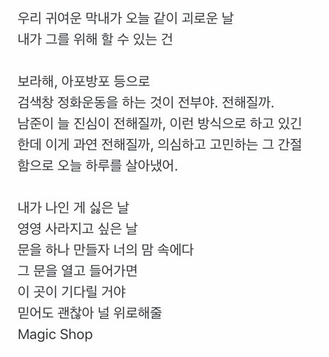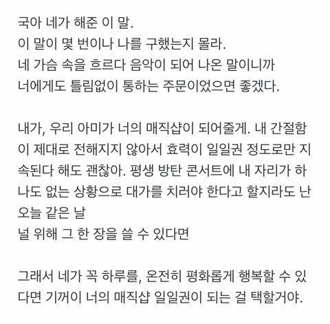 이게 내 마음이고,이게 우리들의 마음이야 다른건 안봐도 되니까 저 글 만큼은 정국이가 봐줬으면 좋겠어 ㅠㅠ 그냥 너를 너무 너무 사랑해