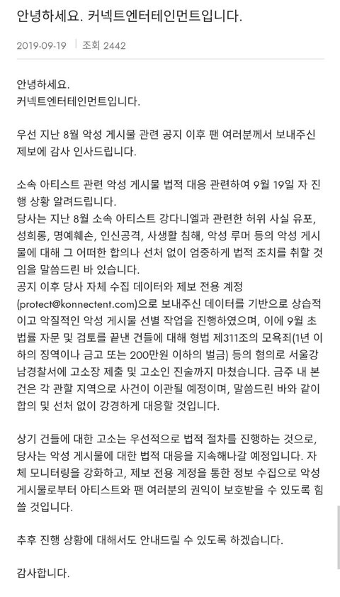 커넥트엔터테인먼트 고소 진행상황 공지도 올라왔으니 보고가