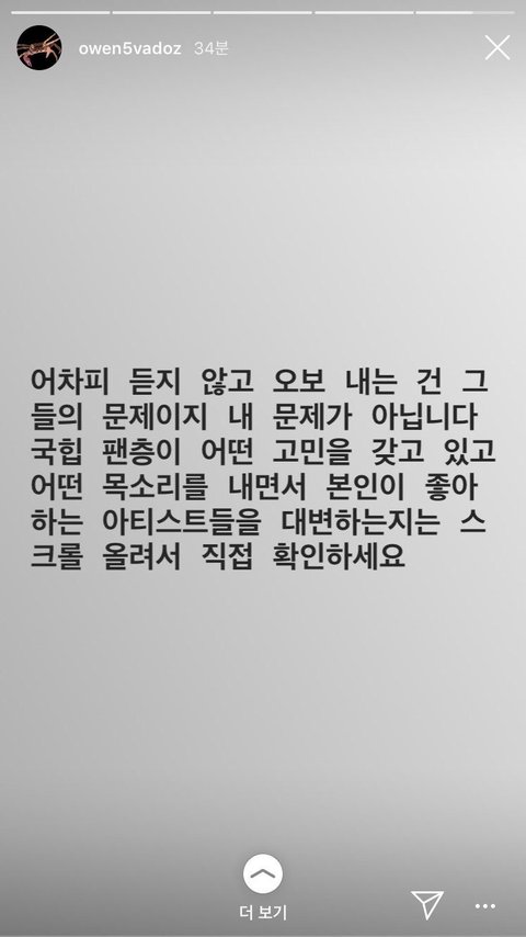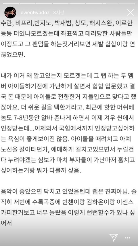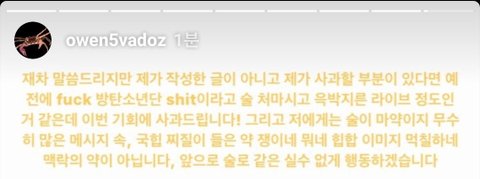 (4) 그리고 마지막 지금 오왼 스토리는 아마 지웠음 이거 진짜 공감성 수치 오짐 오왼이 무슨 말을 하고 싶은지 여기서 다 물거품 처럼 사라져버림 자기가 방송 (아마 인스타라방?) 술 먹고 fuXX 방탄소년단 shit 한거 사과함 아무도 모르고 몰랐던 사실이였음 한마디로 완전 tmi