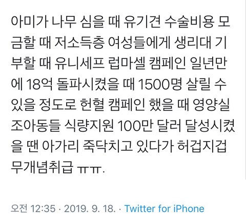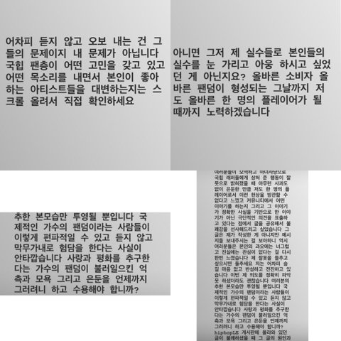 (2) 정리하자면 저거 흰색 배경에 쓴 글은 자기가 쓴 글이 아니고 다른사람이 쓴 글을 퍼온거임 공감해서 가지고 온듯 올바른 팬덤 소비자 형성 하겠다고 하는데 백인여성 강간하고 싶다고 말하는 애가 뭘 반성하고 있다는건지 조금 의아함 사랑과 평화를 추구하는 가수와 그의 팬덤은 (밑에사진) 저런 일 했네요
