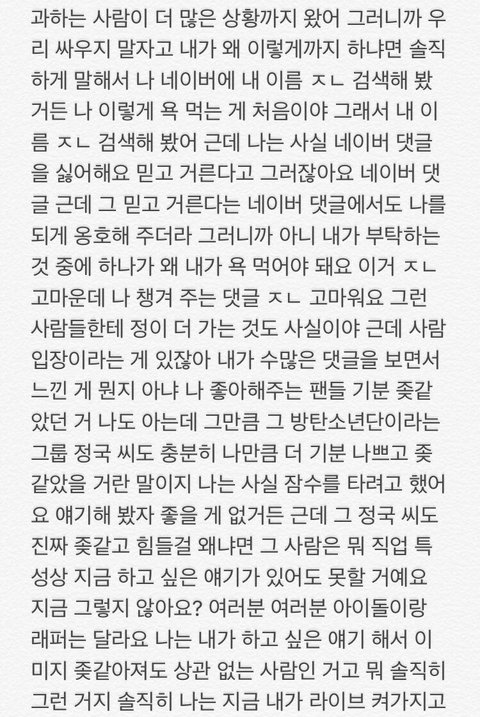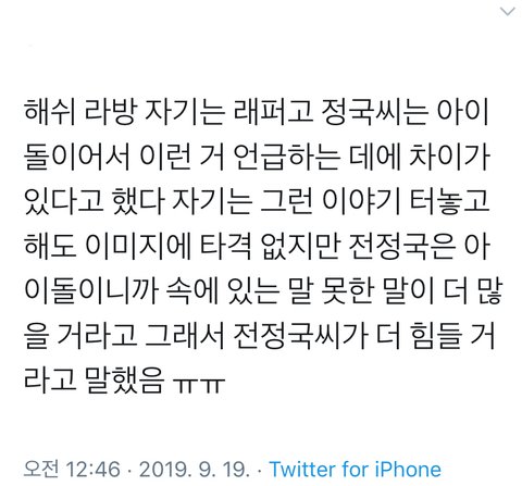 정국 그사람 직업 특성상 하고싶은 얘기가 있어도 말 못할거라고 아이돌이랑 래퍼는 다르다고 나는 표현을 할 수 있는데 그 사람은 어떤 말도 못할거라고 정국이 가지고 있는 목표랑 성향이 자기랑 다르다고 하더라 근데 이 말은 모든 아이돌 팬이 공감하지 않을까 해.