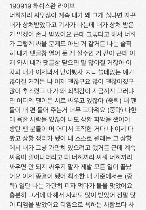해쉬 팬들이 정리한거 가져온거야 해쉬가 자기를 욕 하는 디엠 보다 더 많이 받았다고 해 방탄팬들의 사과 디엠이래 나랑 관련이 없는 사람 조차도 디엠이 왔다고 해 근데 사과하면서 자꾸 양측 팬들끼리 싸우니까 그게 정말 힘든가봐 서로 그만 하는게 좋을듯 해