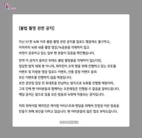 엑스원팬덤의 불법촬영으로 방금 올라온 KBS WE K-POP 공지