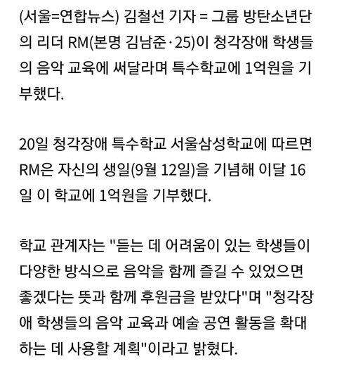 네1이트 메인 기사 ➖ 방탄소년단 RM, 청각1장애학교에 1억 기부…"음악교육에 써달라"