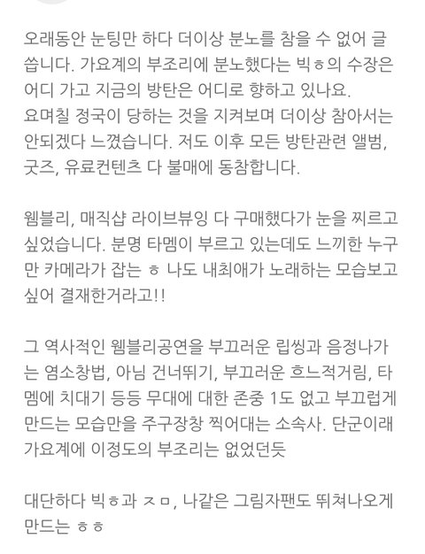 이에따라 아래 의견에 동의하며 빅히트의 개선이 확인될때까지 모든 컨텐츠에 대한 불매를 하고자합니다.