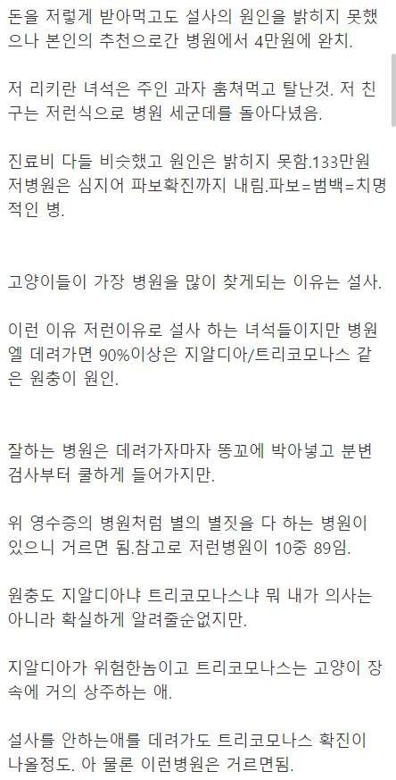 진짜 동물 과잉진료...하.. 13살 냥이 키우는데 3년전부터 애 배 피부벗겨지고 오돌토돌 알러지처럼 올라오고 설사╋토 해서 너무 급해서 잘한단 병원 다 돌아다녀도 원인 못찾음. 돈도 어마무시하게 깨짐. 냥이카페에 가서 사연올리고 잘하는곳 추천 부탁드린다고 해서 마지막으로 간곳에서 선생님한테 말씀 드리고 냥이 케이지에서 꺼내려니까 애 스트레스 받으니 꺼내지 말라고 밖에서 우선 본다고 하시면서 찬찬히 보시곤 애가 경계심 좀 사라진후 촉진하며 검사하시다 피식 웃으심. 왜그러시냐니까 얘는 스트레스성이라고 더 스트레스 줄지 모르니 검사도 패스, 더이상의 촉진도 패스라고 하심. 설사도 벌써 이주넘게 했으니 잡히는것도 이주는 잡아야 한다고 병원식╋조절과 스트레스 원인 찾아서 될수있는한 없애줬더니 다 나음 ㅜㅜ......진짜 감동이..지금껏 쓴돈에 비교도 안되는 진료비.. 잘하는 선생님들 병원 찾아가는것도 진짜 반려동물 키우는 사람한테는 필수임ㅠㅠ