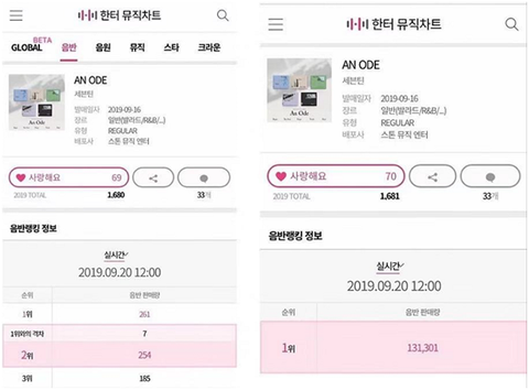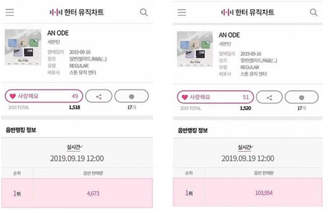 세븐틴 9월16일에 컴백한 정규 3집 칸토차트에 5일차 성적은 자기 지난번의 누적 판매량을 넘어 65만장까지 됐고, 배수로 늘어난 숫자가 의문이되는 부분있다: 음원성적, 유튜브 조회 지난번 컴백에 비해 크게 줄어든 동시에 판매는 크게 늘었네?