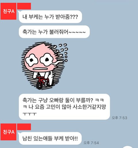 그리고 결혼식함. 친구 1명이 부케를 받고, 1명은 돈을 받아주는 역할을 함.