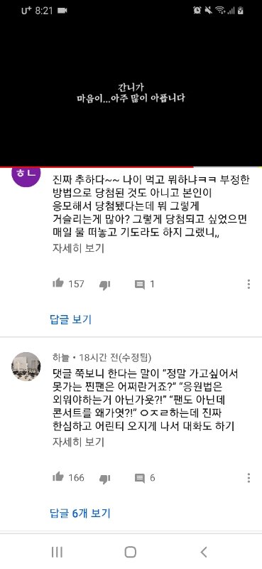 긴니난니라는 계정명으로 활동하던 13살짜리 여자애가 방탄 국내 콘서트 티켓에 당첨됬는데 어떤 아미 한 명이 아미 1~6기 대상으로 하는 건데 왜 잡덕은 가면서 찐팬은 못가냐고 하소연 했고 트위터에선 아미들이 이 여자애 돌려까는 중이래;;;결국 어머니분이 대신 영상까지 올리면서 자제하라고 하시는 상황까지 옴