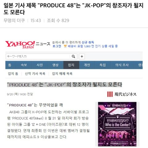 밑에 쉴드치는애야 당연히 케이팝얘기도 해야지 jkpop이라고 케이팝에 수저얹는중인데 ㅇㅇ 일본에서 48은 퇴물이미지고 케팝은 힙하고 유행인 이미진데얘네가 바라는건 그런 잘나가는 kpop에 우리 에케비 멤버가 셋이나?! 이게 주목적인데 케이팝얘길 안하겠냐 거기다 아키모토사단 48사단으로 짬뽕시켜서 케이팝╋48로 소개되는게 팩튼데