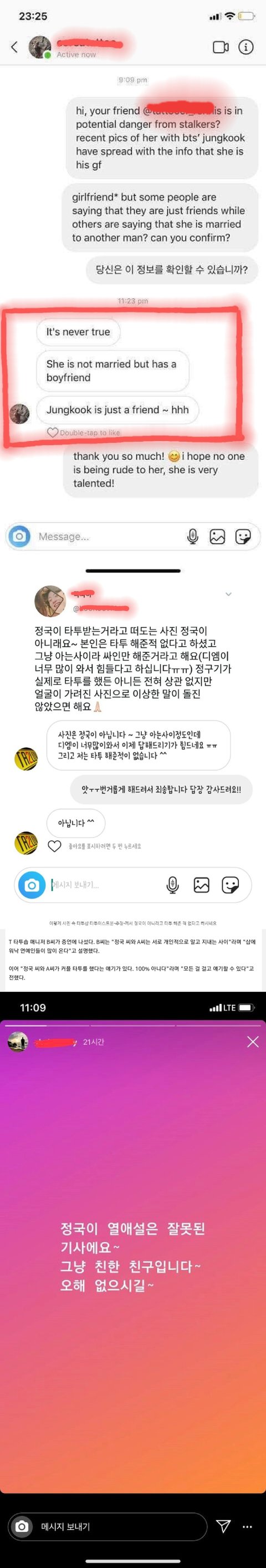 타투샵 매니저는 본인이 정국의 타투를 한게 아니며 정국은 그냥 친구이고 모 언론과의 인터뷰에서 둘이 안사귀고 절대 커플타투가 아니라며 본인의 모든걸 걸겠다고 말하심