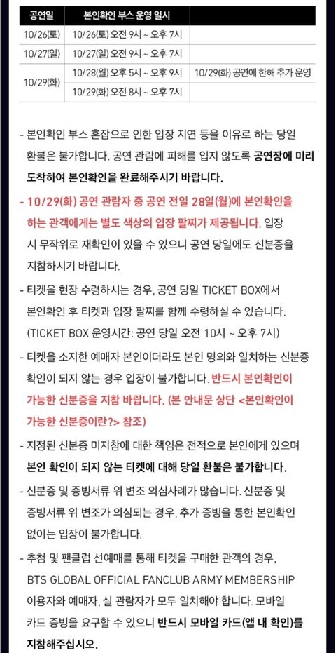 머스터 갔다왔는뎅. 머스터 때 본인확인 부스 있었음. 확인하시는 분들 책상에 쫙~ 앉아계시고, 줄 서서 그 앞에 가면 사진있는 신분증, 인팍티켓 일단 확인했고, 아미카드도 보여드림. 그리고 그 분들이 세개 다 비교해서 확인하고, 그러고 나서 질문을 받음. 랜덤으로 본인 정보를 물어봄. 나 같은 경우에는 전화번호 물어보던데. 되게 긴장되었음. 내 정보 맞는데도 긴장되고 막 그랬는데. 다행히 내 번호 줄줄 잘 얘기하고 확인되었다고 해주고. 다시한번 신분증, 티켓, 아미카드 비교해보고 나서, 드디어 손목에 팔찌를 채워줌. 팔찌도 정해진 손목에 채워주고. 채우고 나면 못뺌. 팔찌는 천 재질이라서 물이 닿아도 괜찮았음. 팔찌 빼려고 하다가는 천 찢어짐 갈기갈기 ㅇㅇ 그랬음. 더 궁금한거 있으면 대댓달면 알려주께