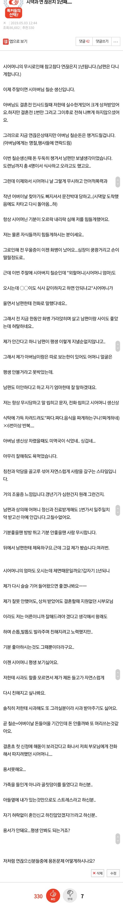 시어머니 답장은 겉으로만보고 답장 안했어요.(1이 안없어지게)