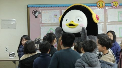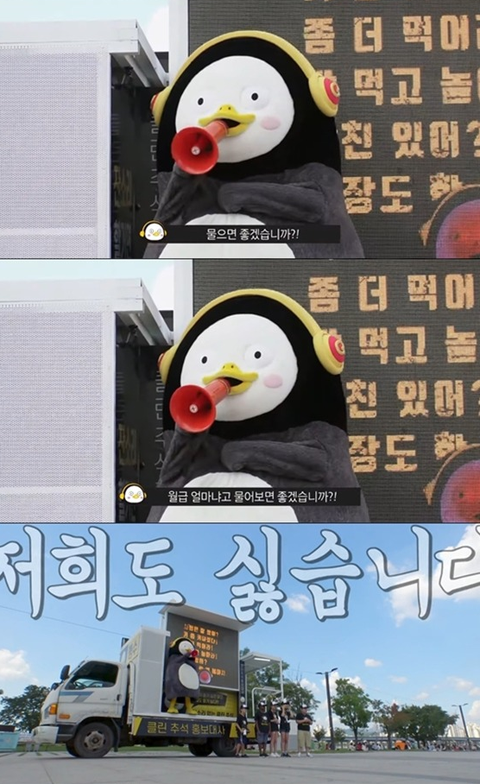 길거리 시민들에게 외치는 펭수