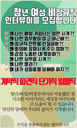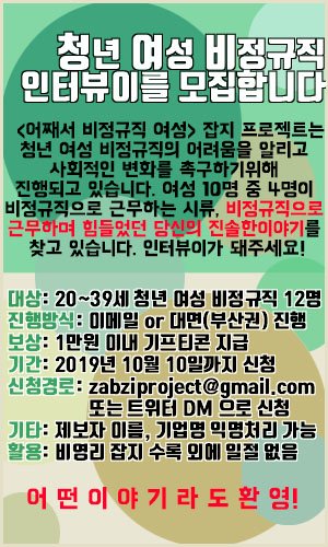 진짜 그냥 여성청년비정규직 문제를 알리고 해결하기위해서 만들어짐...!!내가 아는 친구들이 기획중이라 가져왔음 ㅠㅠ인터뷰이를 구하고 있는데 인터뷰이들이 아직 많이 안모였음..비영리잡지라 보상이 화려하진않지만 익명처리 해주고깊티도 주니까.... 속상한일 있으면 한번 털어놓으면 좋을듯?...!!