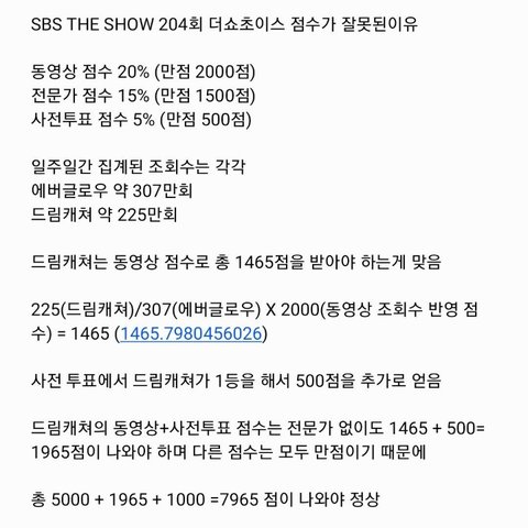 사전투표1위(500점) + 동영상점수 1465점 합하면 1850점이 아닌 1965점이 나오는데 115점 까먹음