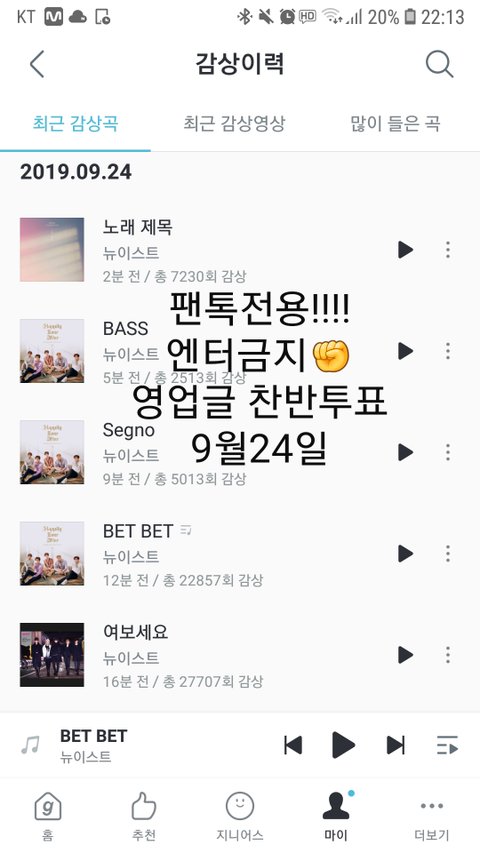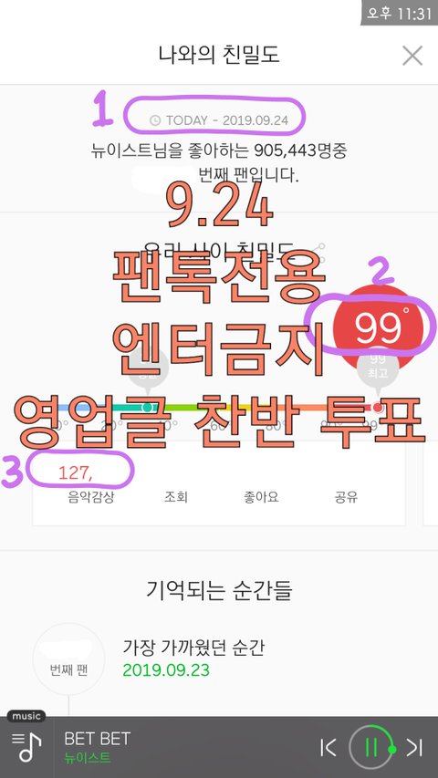 인증에는 ✔오늘 날짜, 온도, 음악감상 횟수 앞자리✔가 보여야 하며 "팬톡전용 엔터금지 영업글 찬반 투표" 낙서가 포함되어야 해