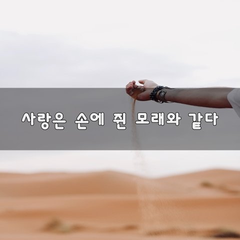 사랑은 손에 쥔 모래와 같다.손바닥을 편 채 가만히 있으면흘러내리지 않는다. 하지만 꽉 잡으려고 손을 움켜쥐는 순간 모래는 손가락 사이로 흘러내리고 손바닥엔 조금만 남게 된다. 사랑도 그렇다.두 사람이 서로 존경하는 마음으로서로의 자유를 인정하며서로에게 조금의 여유를 주면사랑은 오래 머문다. 하지만 너무 강한 소유욕으로서로를 꽉 움켜쥐면사랑은 어느새 두 사람 사이를빠져나가 영영 돌아오지 않는다.