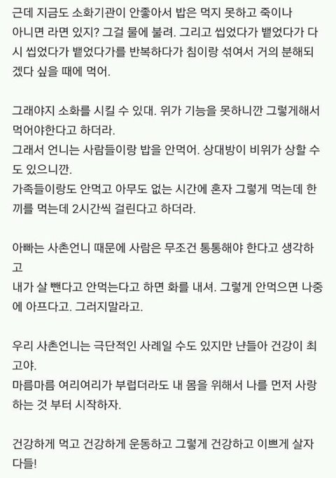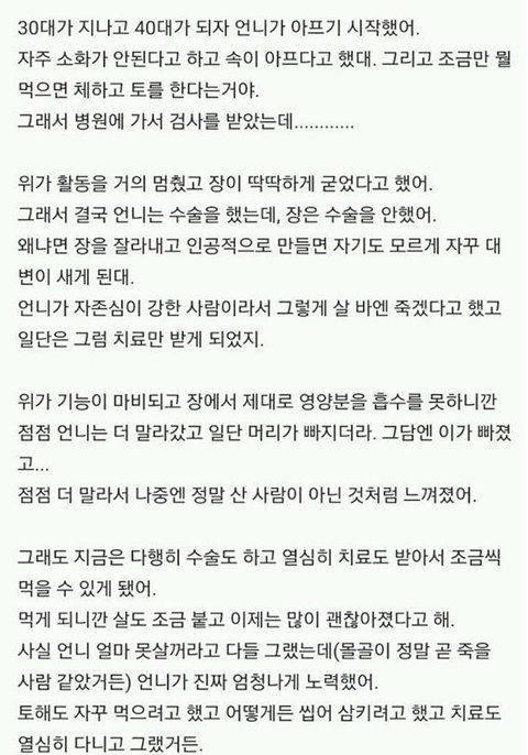 저렇게 오랜기간을 버텨왔다는게 신기하다. 저거 거식증이잖음 보통 식이장애 걸리면 폭식증도 같이오던데 계속 식사량 조절하는게 가능하다니 저 사람 정신력 하나는 대단한듯