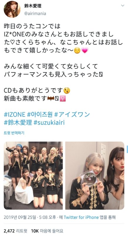 아이즈원과 스즈키 아이리 모두 이쁘다 ㅠㅠㅜㅜ 참고로 스즈키 아이리는 가창력 좋은걸로 유명하고 12년간 그룹 활동하고 해산한 후 솔로 활동을 이어나가고 있어!! 나코가 가장 팬이래 ㅋㅋㅋㅋ