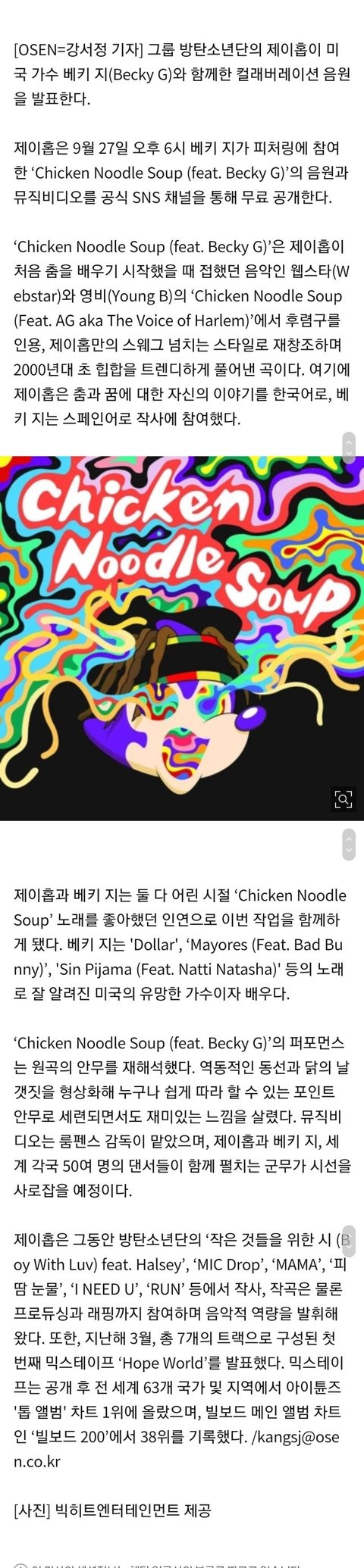 방탄 제이홉, 美 가수 베키 지와 콜라보 오늘 음원 무료 공개