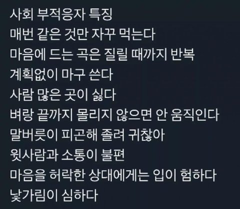사람많은곳 싫고 학교에서 옆자리에 짝 앉는것도 싫음