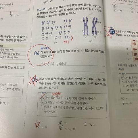5번에서. 답지에서 (ㄱ)번이 생식세포를 이용한게 아니라 체세포를 이용한 핵형분석 결과라서 틀린거라는데