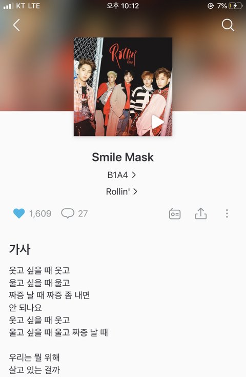 와 아니 어디서 스쳐서 봤는데 b1a4 노래중에 스마일 마스크? 라고 있나 쨋든 그게 2년전ㅁ쯤에 나온 노래로 아는데 갓진영이라고 불리는 이유가 있구나 새삼 깨달음 ㅇㅇ 노래 제목이 스마일 마스큰데 이게 요즘 현실 반영 ㄹㅇ 기분 안좋아도 웃고 있는척 감정 숨기고 맨날 밝은 척 하는 이런 증후군 같은ㄷ건데 진짜 개천재다 ㄹㅇ