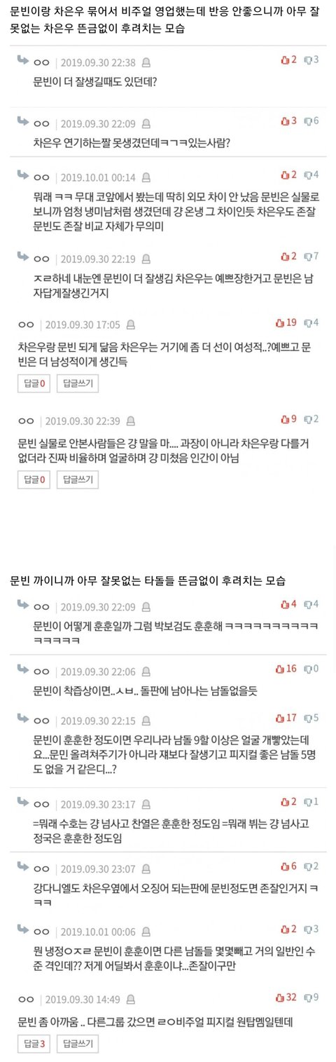 정말 의문스럽게도 차은우랑 다른 아이돌들 후려치기 당할땐 하루종일 아무런 피드백이 없다가 댓글에서 이에 대한 의문이 제기되자 얼마안가 바로 새벽에 글삭됨