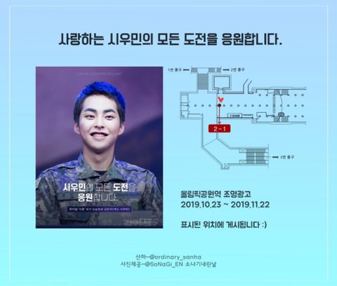 산하님께서 시우민의 뮤지컬 도전을 응원하는 조명광고를 올림픽공원역에 게시하셨는데 산하님! 소중한 광고 정말 감사드려요ㅠㅠㅠ