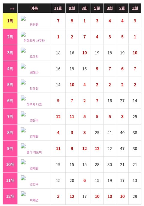 이채연은 순위 더 높았었을걸 사쿠라랑 이채연 서사로 어그로 끌려고 늦게 부른거 같은디 ㅋㅋ