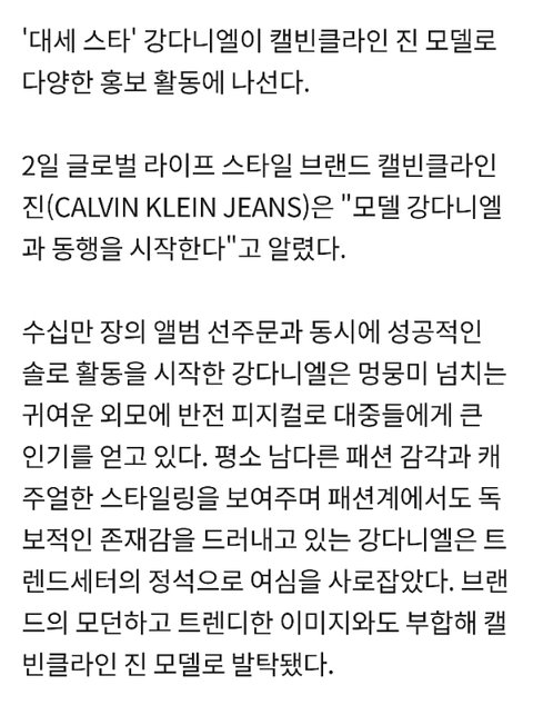 캘빈클라인 진 관계자에 따르면 트렌드세터의 정석으로 많은 여심을 사로잡는 강다니엘이 브랜드의 모던하고 트렌디한 이미지와 부합해 캘빈클라인 진의 모델로 발탁됐다.