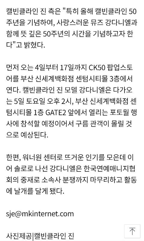 CK50 팝업스토어를 부산 신세계백화점 센텀시티몰 3층에서 오는 10월 4일부터 10월 17일까지 오픈한다. 캘빈클라인 진 모델 강다니엘은 다가오는 10월 5일 토요일 오후 2시, 부산 신세계백화점 센텀시티몰 1층 GATE2 앞에서 열리는 포토월 행사에 참석할 예정이며 앞으로 캘빈클라인 진(CALVIN KLEIN JEANS)과 함께 할 활발한 활동으로 기대를 모으고 있다.