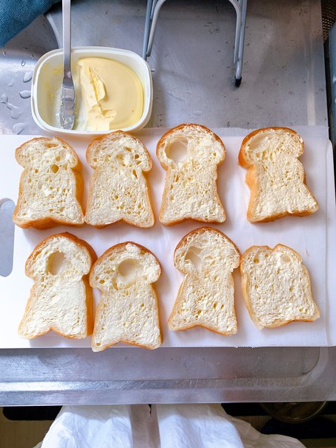 빵칼로 자를때 너무 부드러워서 꾸겨져버리는 참사가 일어났지만 뭐 꼬깃꼬깃 종이 펴는 거마냥 잘펴니 나름 봐줄만한 빵에 소프트 버터( 다른 분들은 버터를 녹이고 우유나 두유도 넣는다고 하시나 난 걍 버터 덕지, 우유 잘 모마심)를 슥슥 바르고